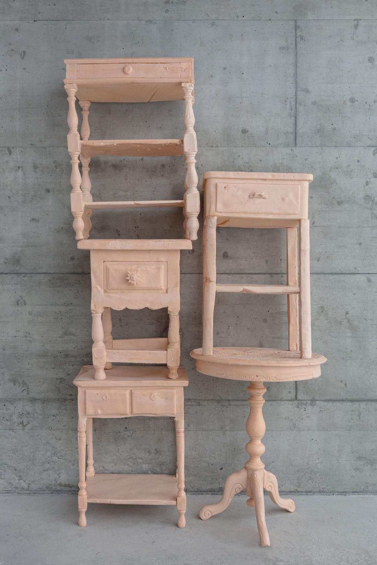 Corps empilés is a readymade sculptural object with typical wooden bedside tables from the 1970s (a symbol of bourgeois interiors and private intimacy) - cast in PU construction foam, a coarse, industrial material.